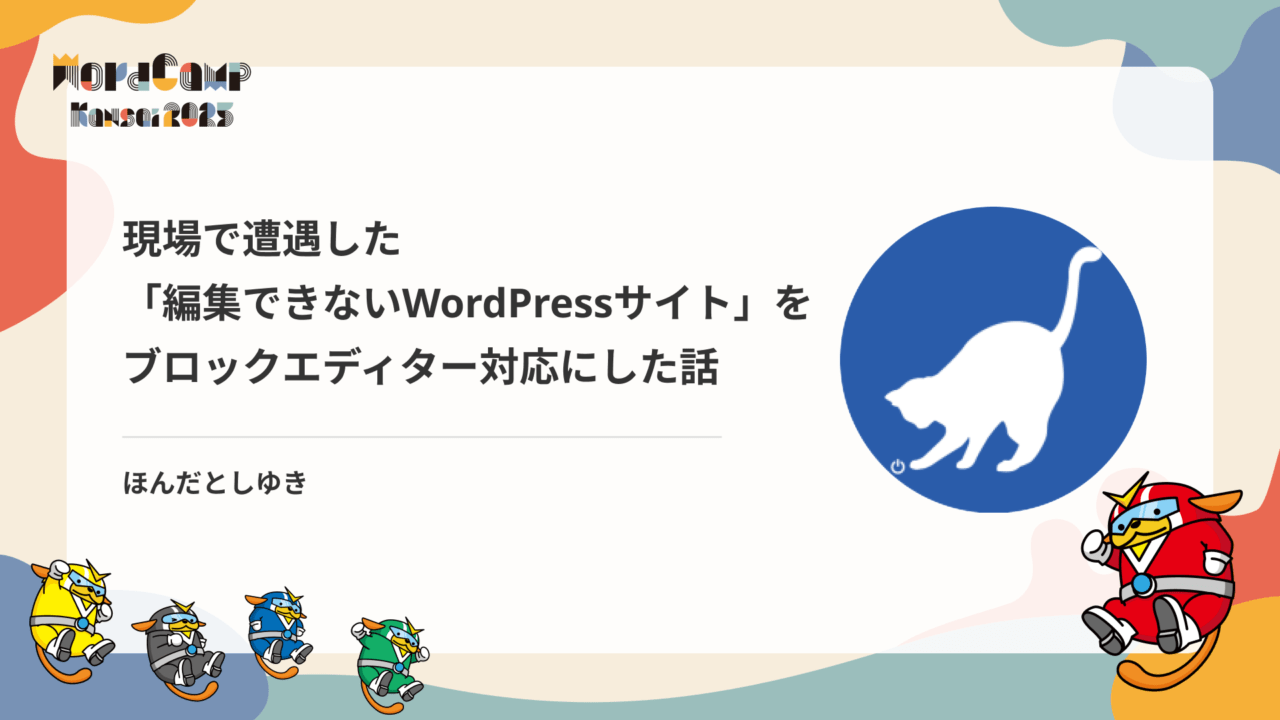 セッションデイでは、「現場で遭遇した「編集できないWordPressサイト」をブロックエディター対応にした話」というタイトルで登壇しました。